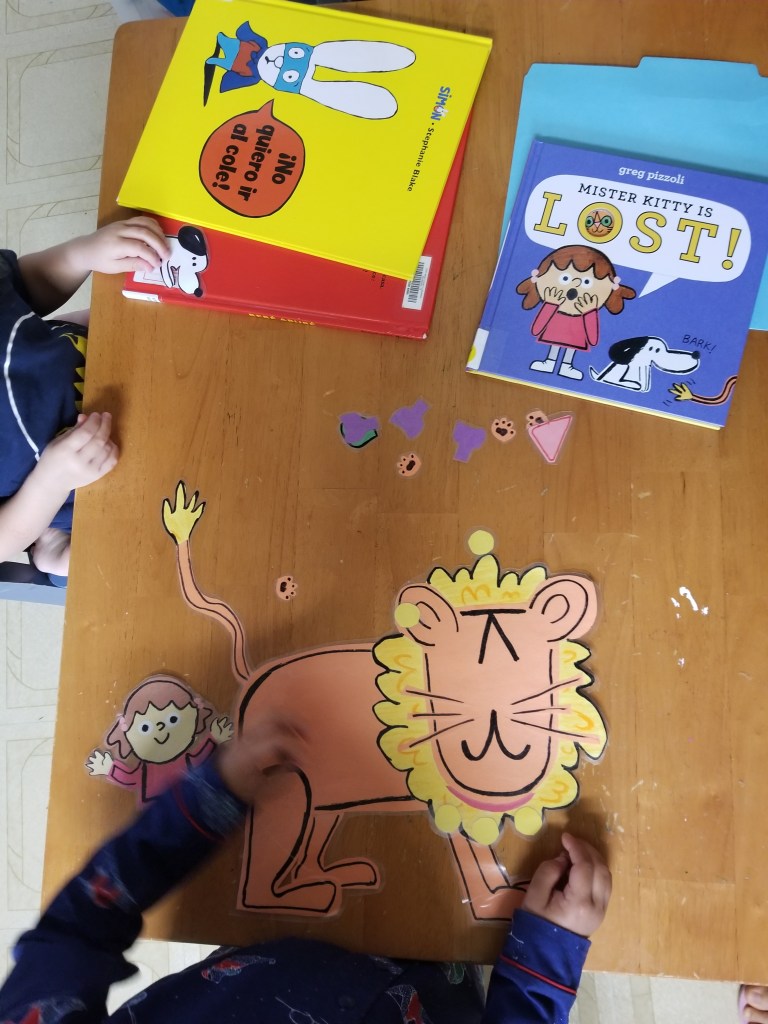 Seen above is my nephew putting Mister Kitty together. I hid Mister Kitty first and we went looking for him after reading the book. Then, the kids took turns hiding the dog as well, who ends up missing at the end of the book. Very fun!